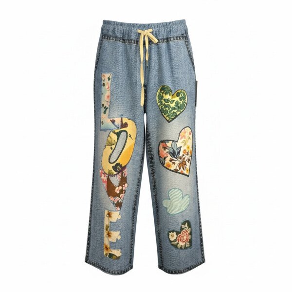 PANTALÓN DE TELA , CON DIBUJOS EN PARTE DELANTERA Y TRASERA